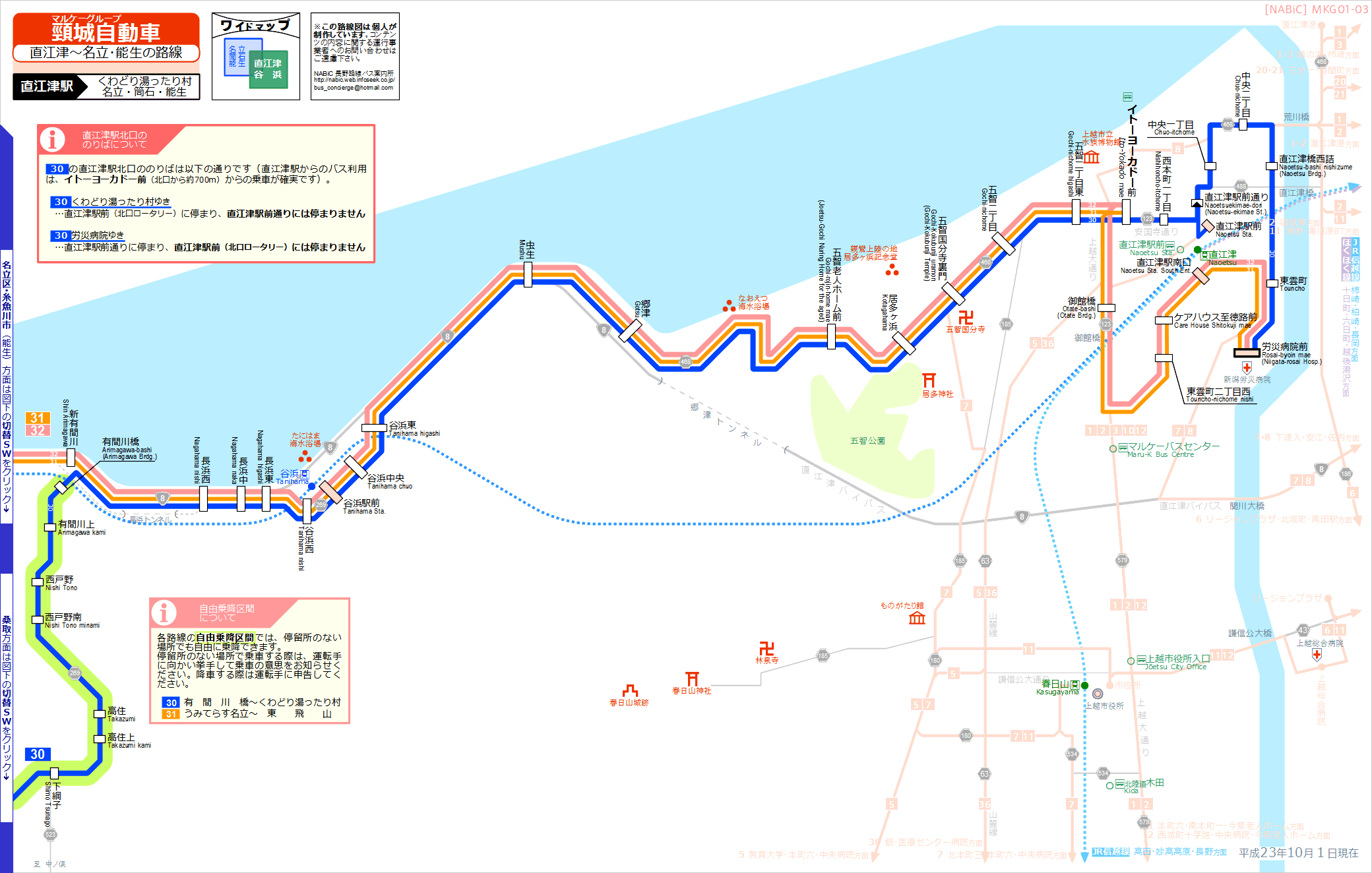 | 名立線 | 31 | (労災病院〜直江津駅南口〜イトーヨーカドー前〜五智国分寺〜郷津〜谷浜駅前〜有間川駅前〜乳母嶽神社前〜)うみてらす名立前〜名立駅前〜折居〜森〜ろばた館前〜東飛山 | ||